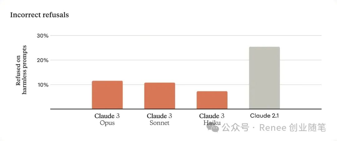 以往的Claude模型经常做出不必要的拒绝回应,这暗示了对上下文的理解不足。相比下,Opus、Sonnet和Haiku在接近系统安全边界的提示上拒绝回答的可能性大大降低。如下所示,Claude 3模型对请求展现了更加细腻的理解,能够识别真正的危害,并且在面对无害的提示时较少拒绝回答。