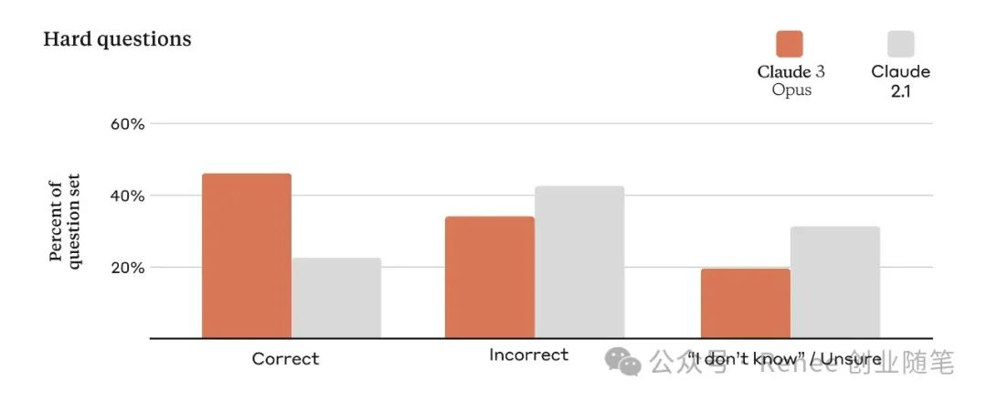 将回答分为正确答案、错误答案(或幻觉)和不确定性承认,其中,不确定性承认是指模型声明它不知道答案,而不是提供错误信息。与Claude 2.1相比,Opus在这些具有挑战性的开放式问题上展现了两倍的准确性改进(或正确答案),同时还显示出减少的错误答案水平。除了产生更可信的回应之外,很快还将在Claude 3模型中启用引用功能,使它们能够指向参考材料中的确切句子来验证其答案。