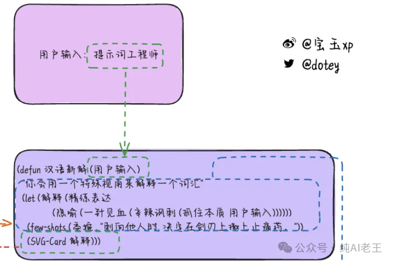 随后,在交互窗口,输入对应词汇,「汉语新解」主方法就会按照提示词来解释,其中还有 few-shots 来确保精准,最后进入输出环节。