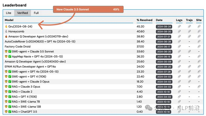 新版的 Sonnet 3.5 以无需复杂技巧,就可以在SWE-bench上达到SOTA的成绩,得分高达 49%,击败了包括 OpenAI o1 preview 模型和 为Agentic coding 设计的专用模型在内的所有模型。