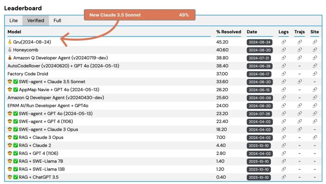 在SWE-bench Verified测试中,Claude 3.5 Sonnet以49%的成绩创下了新的记录,超越了包括OpenAI o1-preview在内的所有公开模型。这个成绩是在不使用复杂辅助框架的情况下取得的,更显示出它强大的编程能力。