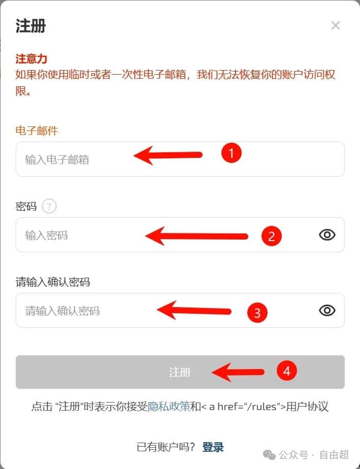 点击右上角的【注册】,填写邮箱,密码进行注册。
