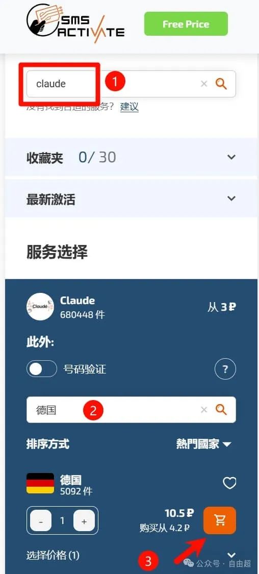 充值之后我们可以左侧搜索claude,会跳出很多国家的手机号。建议搜索使用德国,这是实测下来最容易成功的地区。尽量不要用美国、加拿大、英格兰、智利、印度等。