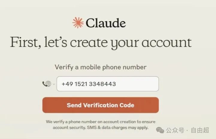 粘贴手机号到Claude注册界面,注意手机号前面要有+,+4915213348443