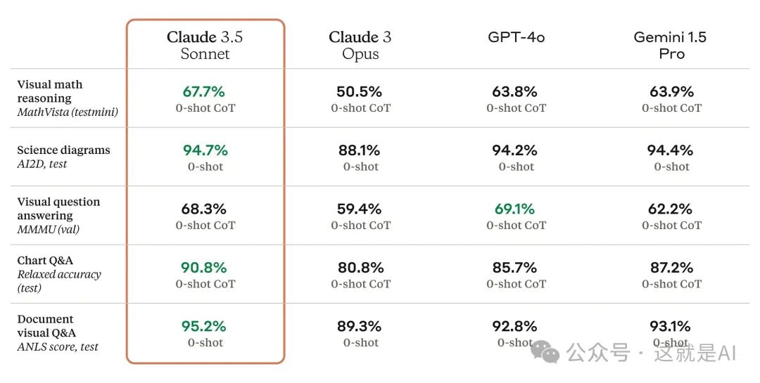 Claude 3.5 Sonnet在视觉模型方面也取得了突破,超越了Claude 3 Opus,尤其在需要视觉推理的任务上,如解释图表和图形。它还能够从不完美的图像中准确转录文本,这对于零售、物流和金融服务等行业来说是一项核心能力,因为AI可能从图像、图形或插图中获得比文本更多的洞察。