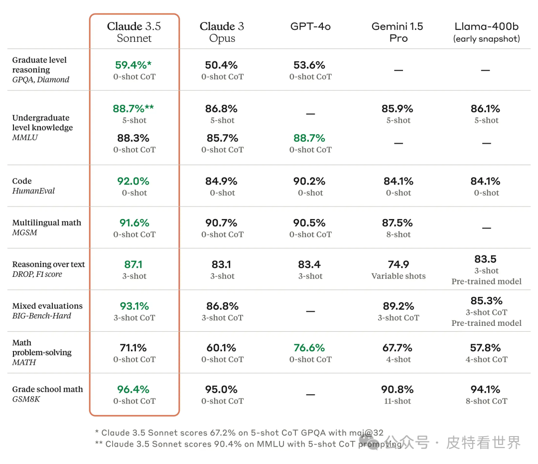 性能提升:在各种评估基准中表现出色,超过了GPT-4o和自家的旗舰模型Claude-3-Opus,同时在保持了上个版本的的推理速度和成本。
