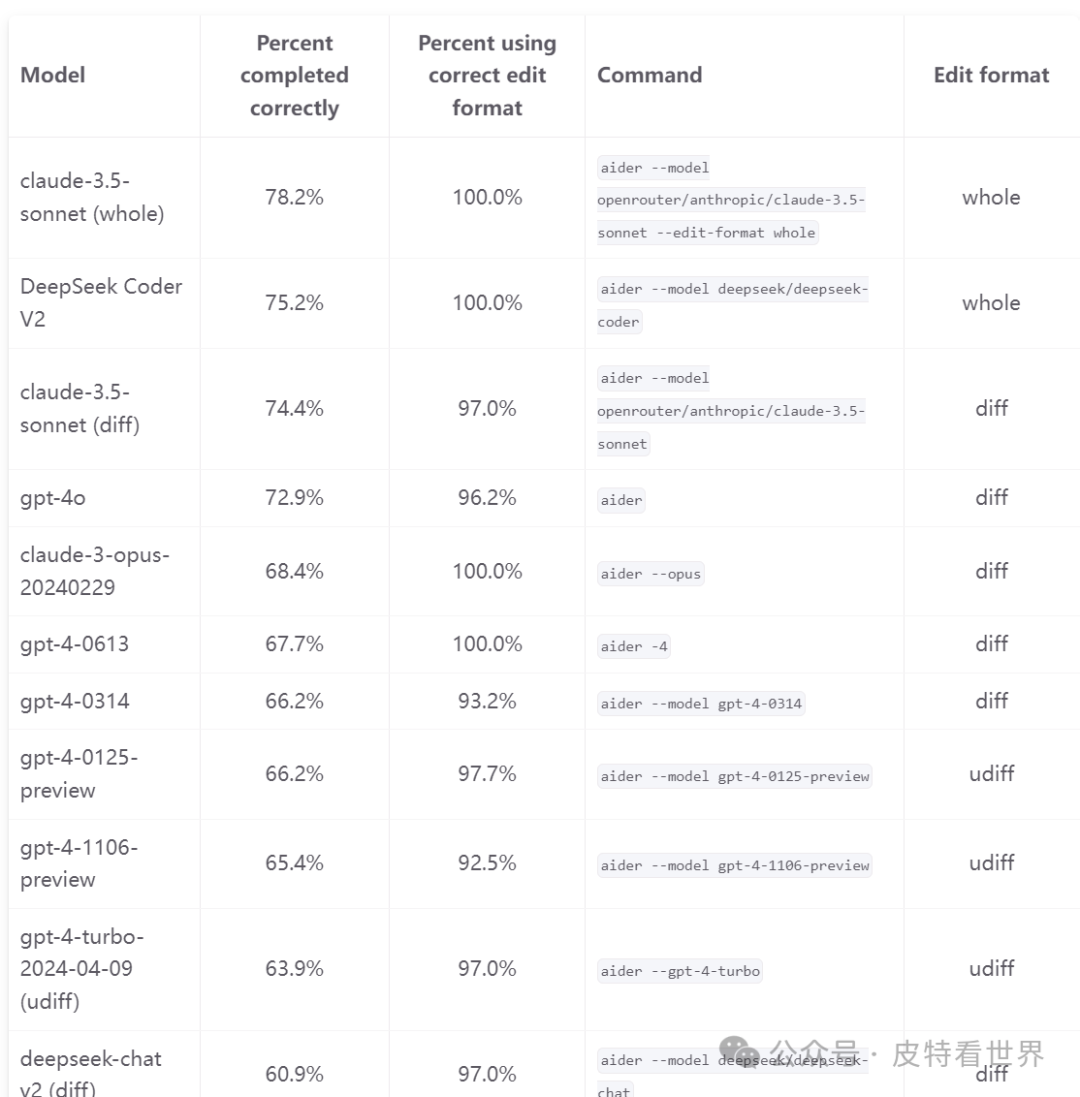 在最新的Aider排行榜上,Claude-3.5-Sonnet解决代码问题的正确率为78.2%,远超GPT-4o的72.9%。最近发布的开源国产大模型DeepSeek-Coder-V2正确率为75.2%,排名第二!