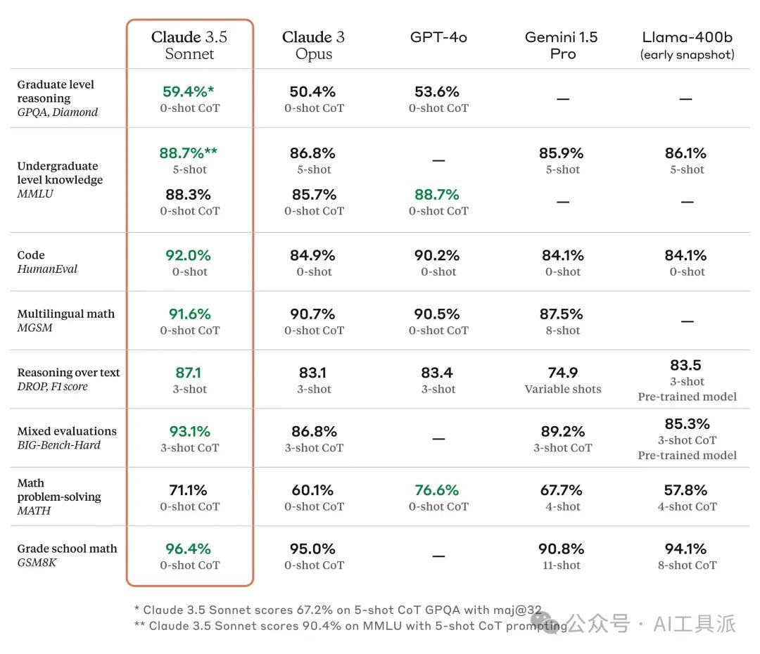 并且 Claude 3.5 Sonnet 在大多数测试中,都能超越 Claude3 Opus、GPT4-o、Gemini1.5 Pro 等。