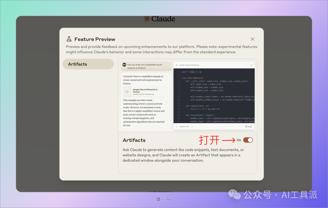打开页面右上角,点击 Feature Preview 菜单; 开启 Artifact。