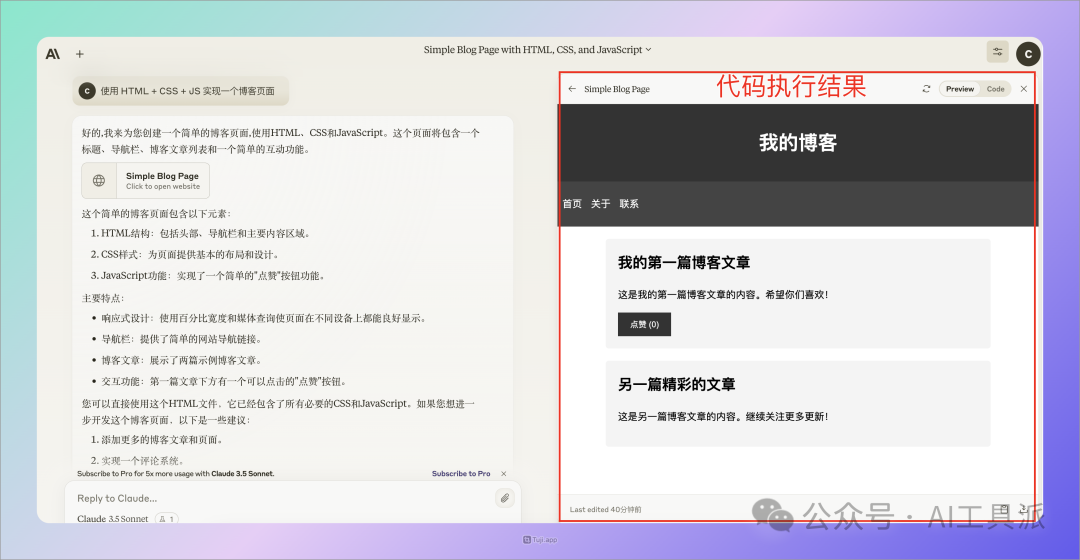 回答完成后,还可以直接查看代码执行的结果,Chris 实现的是一个博客主页,于是就可以在 Artifacts 直接看到博客主页的效果了: