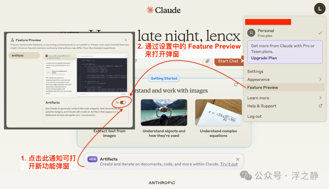 Artifacts 默认是关闭状态,需要手动在弹窗中启用。触发新功能弹窗主要有两种方式: