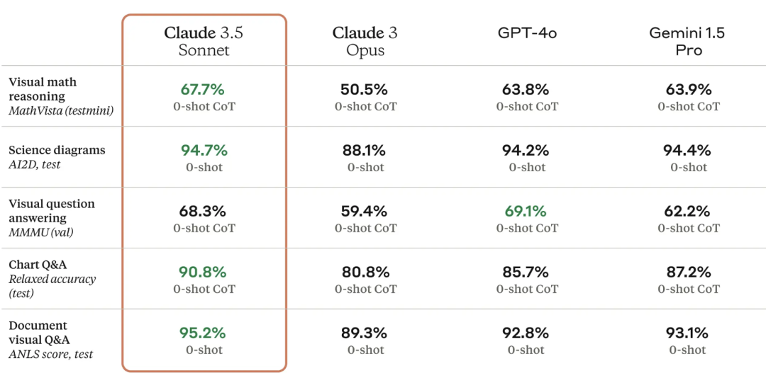 Claude 3.5 Sonnet 是 Anthropic 迄今为止最强大的视觉模型,在标准视觉基准上超越了 Claude 3 Opus。这些重大改进对于需要视觉推理的任务最为明显,例如解释图表和图形。