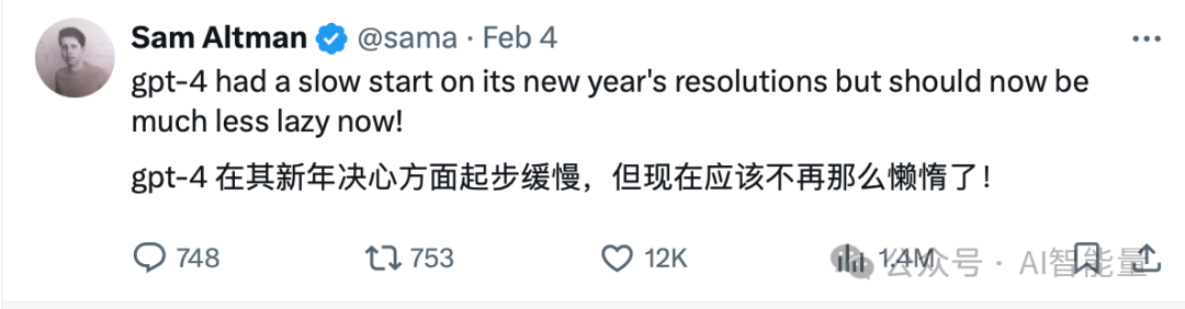 今年早些时候,更多的懒惰证据再次出现,OpenAI 首席执行官 Sam Altman 甚至承认 GPT-4 很懒惰。他二月份在社交媒体上发帖称,已经发布了修复程序来解决投诉。