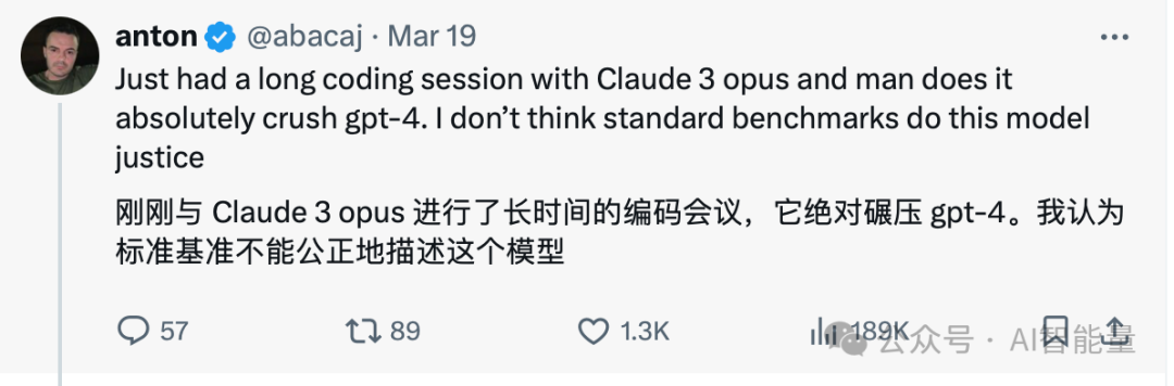 在与 Claude 3 Opus 进行编码会议后,软件工程师 Anton 上周在 社交媒体上得出结论,它碾压了 GPT-4。 “我不认为标准基准能够公正地描述这个模型,”他写道。