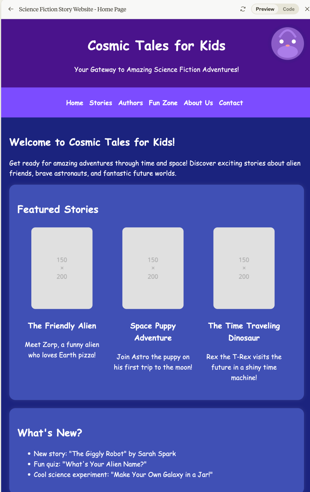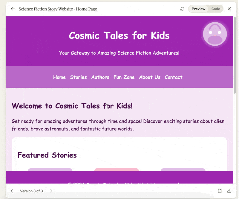 I'm going to make this site suitable for children to read, with richer colors and placeholder images, please draw a space rabbit svg instead, and when the mouse slides to the end, it will appear © 2024 Cosmic Tales. All rights reserved.
