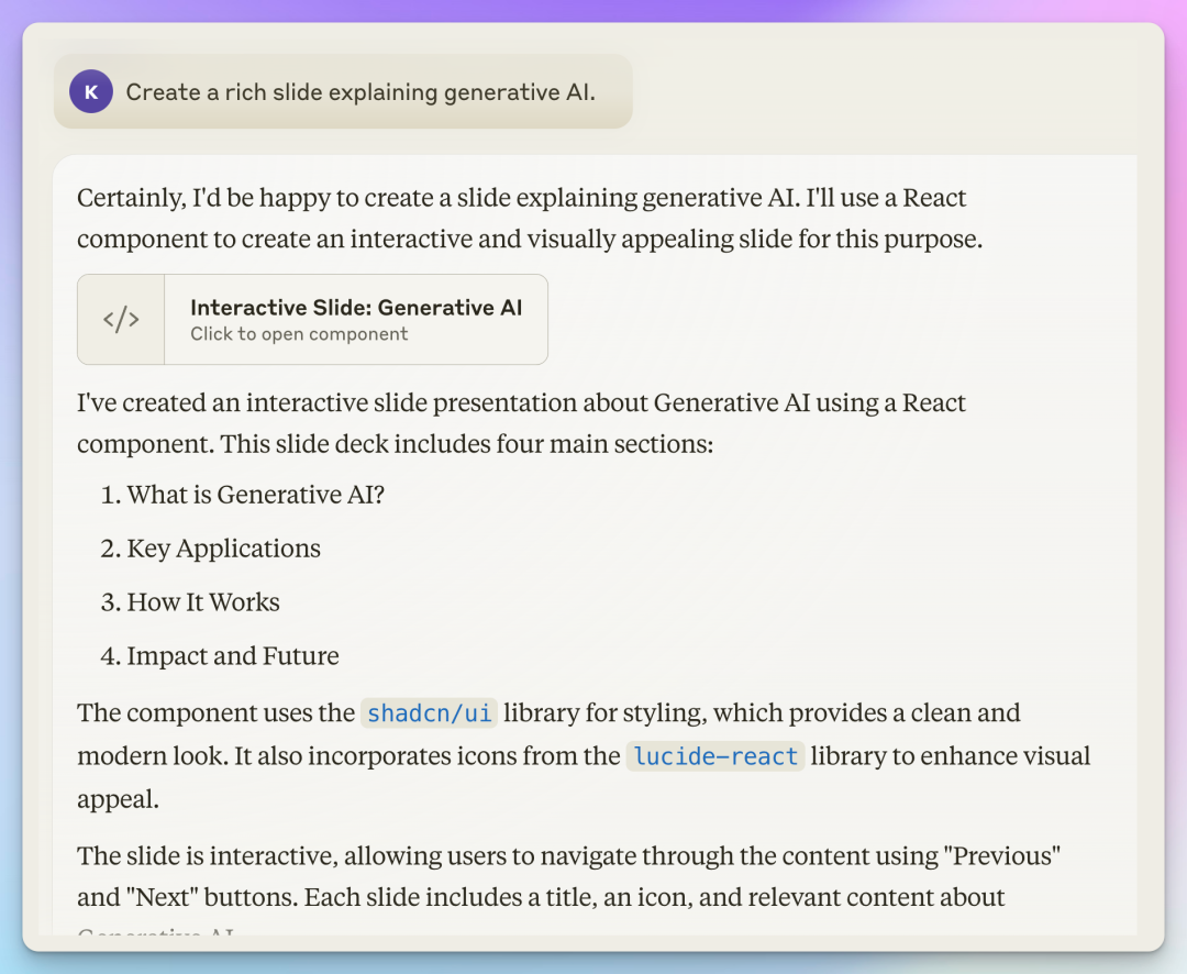 需要注意,如果不明确指定用Reveal.js,它可能用React组件来生成类似下面的页面。