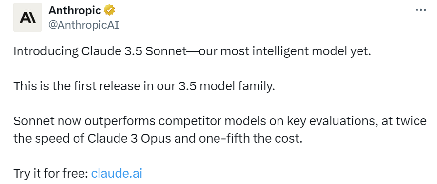 由前 OpenAI 成员组成、谷歌亚马逊相继投资的大模型厂商 Anthropic 发布了全新一代模型—— Claude 3.5 Sonnet 。