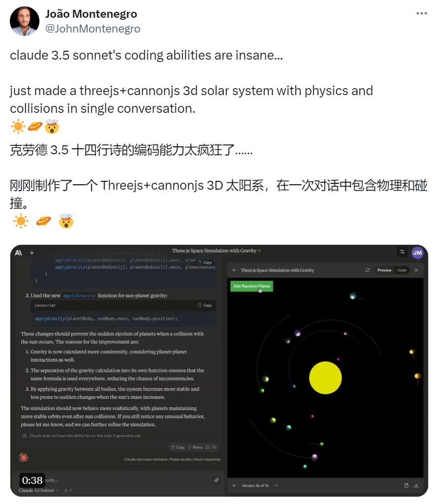 另外,他们还测试了在给出所需改进的自然语言描述情况下,让模型修复错误或向开源代码库添加功能的能力。结果在得到相关指导和工具后,Claude 3.5 Sonnet 则可以独立编写、编辑和执行代码,并具有复杂的推理和故障排除功能。它还可以轻松处理代码转换,使其特别适合更新旧版应用与迁移代码库等。