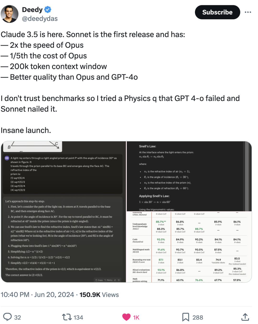 而且这次Claude 3.5 Sonnet在成本上的控制也大大强于上一代产品。在200K上下文窗口的条件下,3美元/15美元百万token的价格也低于5美元/15美元百万token的GPT-4o。