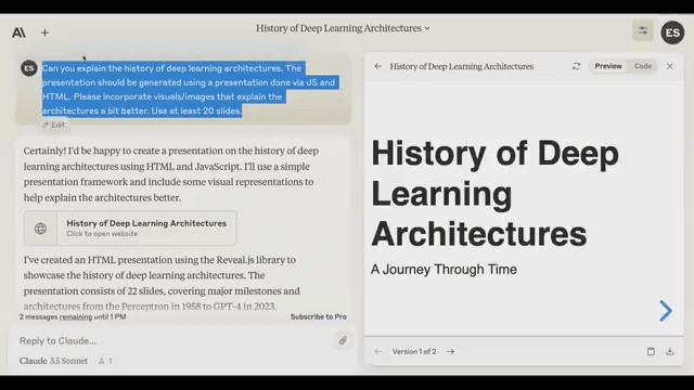 有网友让Claude 3.5直接生成了一段深度学习构架历史的JS演示,还可以直接向里面插入图片。