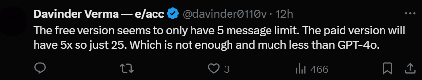 现在网友唯一的不满就是,可用数量相比GPT-4o来说太少了。免费用户3小时只有5次对话,收费用户也只有25次,完全不够!
