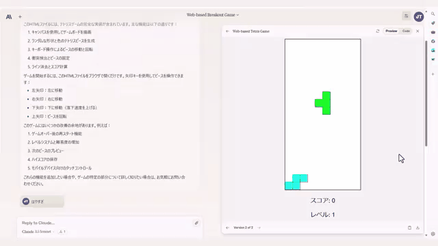 用Claude 3.5先来一段俄罗斯方块的代码,然后直接在Artifacts里开玩。