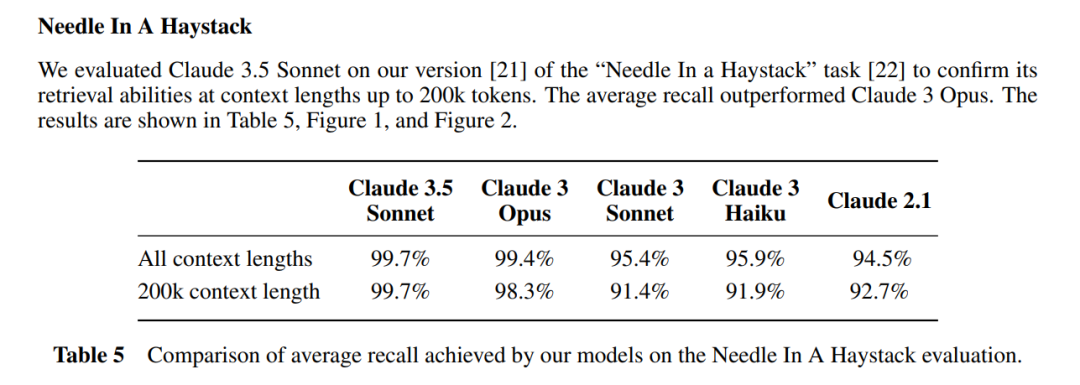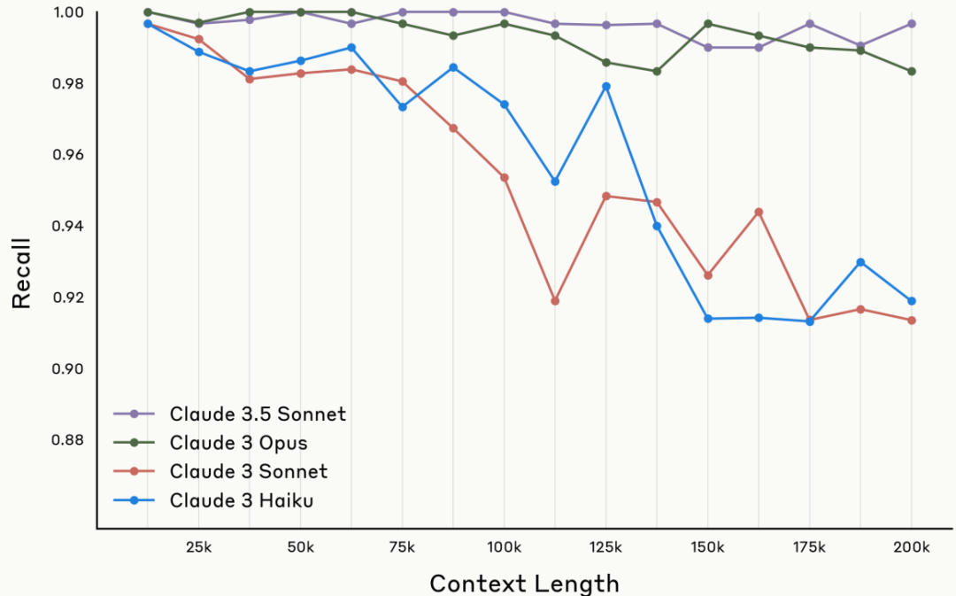 Claude 3.5 Sonnet 在复杂的“大海捞针”(Needle In A Haystack)信息检索任务中显示出卓越的性能,其召回率高达99.7%(高召回率意味着模型能够捕捉到大多数的正类样本,但可能以引入更多的假正例 [False Positives] 为代价),无论是在全部上下文长度还是在高达20万个词符(约10-13万中文字符)的特定长度上均能稳定维持此高水平,超越了Claude 的历史版本。