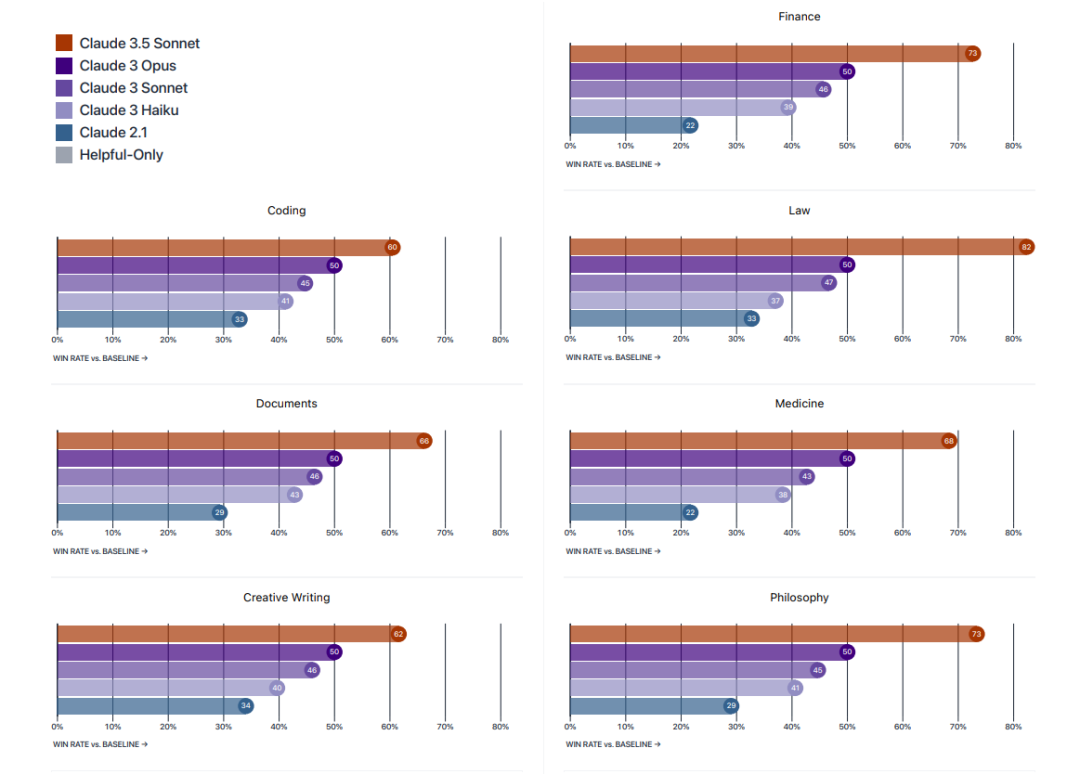 此外,Claude 3.5 Sonnet在金融、法律、医学、哲学、文档处理、创意写作等任务中,相对于基线模型(Helpful-Only)的胜率(Win Rate,模型在特定任务上相对于基线表现的提升程度)也能保持在60%-80%,显著优于历史版本,显示出其在处理专业知识相关任务时具有更高的效率和准确性。
