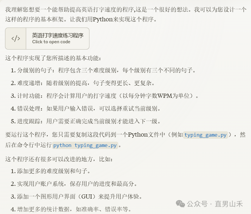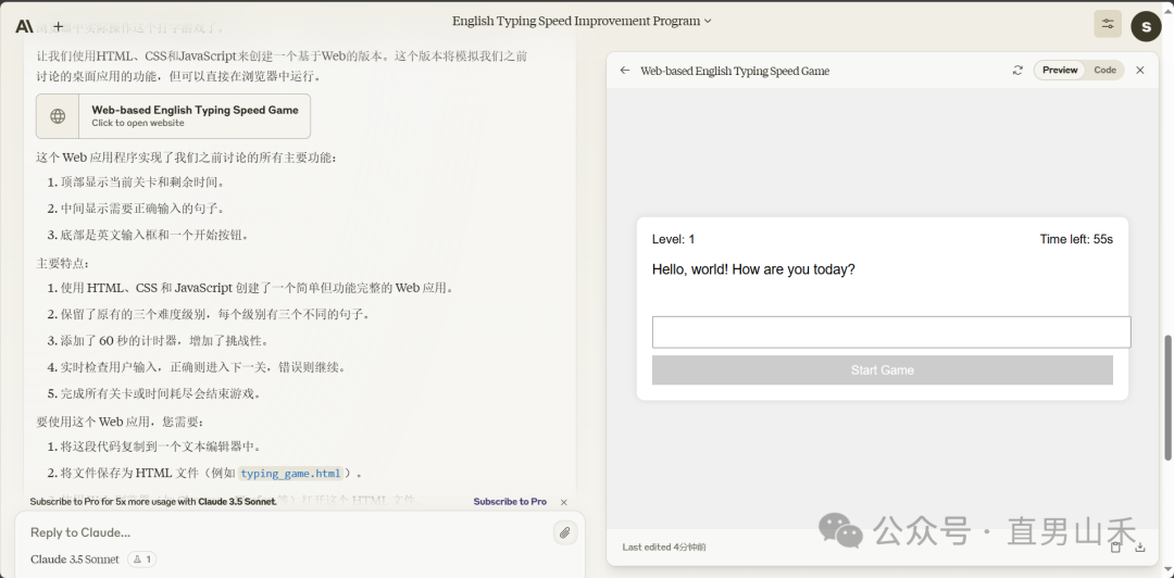 Claude 3.5 Sonnet有强大的就是代码生成和实时展示能力,我们让他设计一个web应用,帮忙提升英文打字的速度