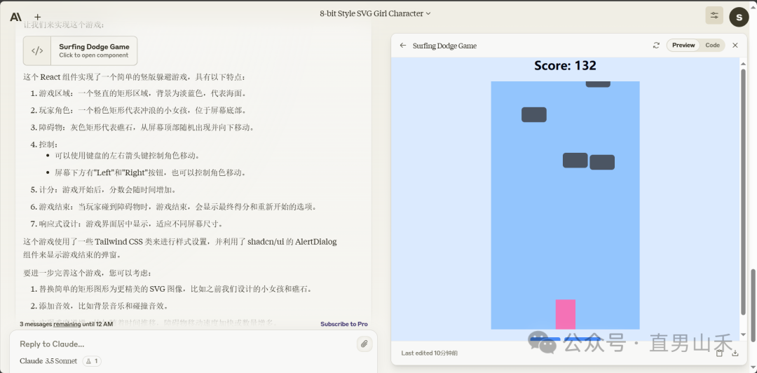 提供一张游戏说明的截图,claude自动对整个游戏进行编码,右侧界面进行预览,还制定了游戏规则。