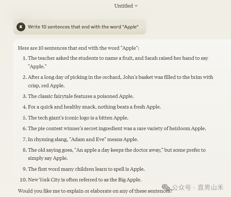 写出10个有逻辑的句子,要求每个句子都以apple结尾,这个问题在测试新模型时很容易被问到,