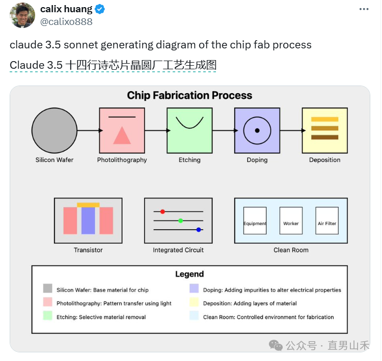 在提示词中写"生成一个图表突出芯片制造流程及每个步骤的关键概念",Claude 3.5 Sonnet会给出一张知识图表。