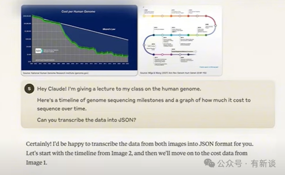 同时,Claude 3.5 Sonnet 迄今为止最强大的视觉模型,在标准视觉基准上超越了 Claude 3 Opus。这些重大改进对于需要视觉推理的任务最为明显,例如解释图表和图形。Claude 3.5 Sonnet 还可以准确地从不完美的图像中转录文本 – 这是零售、物流和金融服务的核心功能,在这些服务中,AI 可以从图像、图形或插图中获得比仅从文本中更多的见解。因为现实世界的图像往往不如理想状态下那么清晰,使得它在各种实际场景中都能发挥作用,特别是在将视觉信息与更广泛的上下文和含义联系起来的能力上,不仅能“看”,还能准确理解图片“内容”。Claude 3.5 Sonnet 结合强大的代码生成能力,将多个模态真正集成在一起。看到图片,立刻生成json文件信息,速度快过任何程序员。