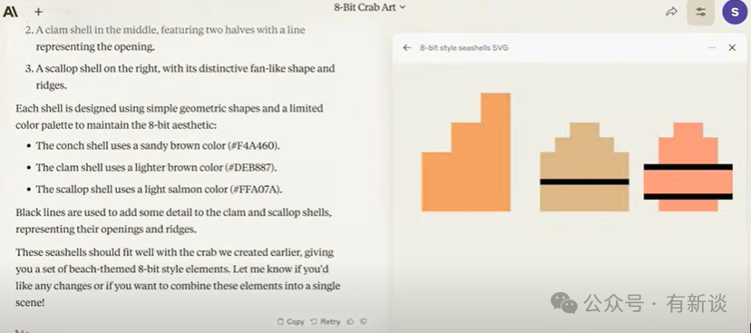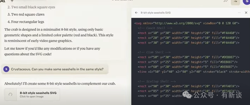 同时Claude 3.5 Sonnet还拥有一个助手——Artifacts。一项扩展用户与 Claude 交互方式的新功能。当用户要求 Claude 生成代码片段、文本文档或者网站设计等内容的时候,Artifacts会出现在对话旁边的专用窗口中,创建一个动态工作空间,用户可以在其中实时查看、编辑和构建 Claude 的创作。将人工智能生成的内容无缝集成到项目和工作流程中。以及基于Claude的创作进行进一步开发,可以将生成的HTML、JS、CSS、SVG 代码都显示出来,可以做个HTML5小游戏、JS 版的 PPT或者网页小动画。Artifacts 预览功能标志着 Claude 从对话式 AI 向协作工作环境的演变,将扩展到团队协助。