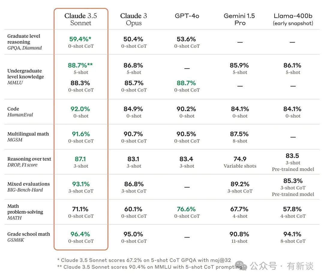 Claude 3.5 Sonnet 设定了新的行业基准。它在理解细微差别、幽默和复杂指令方面表现出显著的进步,并且擅长以自然、亲切的语气撰写高质量的内容。Claude 3.5 Sonnet虽然在零样本MATH和MMLU评测中小幅落后于GPT-4o,但在研究生水平推理 (GPQA)、本科生水平知识 (MMLU) 和编码能力 (HumanEval) 毋庸置疑地刷新了SOTA,对谷歌Gemini.1.5Pro和Llama 400B(早期预览版)实现全面超越。