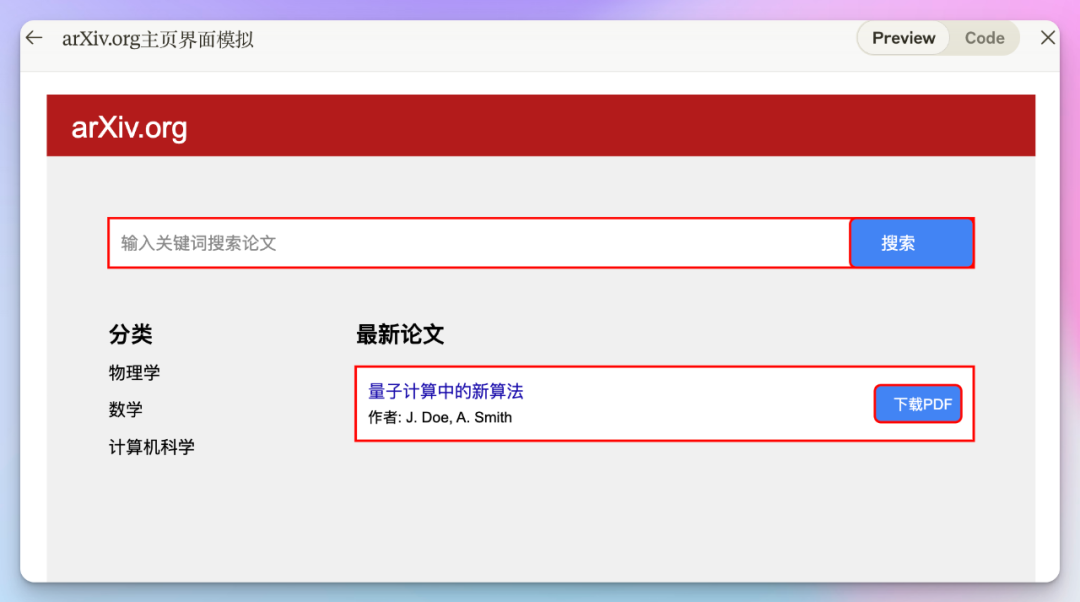 请用SVG创建重现arXiv.org主页界面的图像。同时,请边图示边说明如何搜索和下载一篇科研论文。请用红色方框标注需要点击或输入的区域。