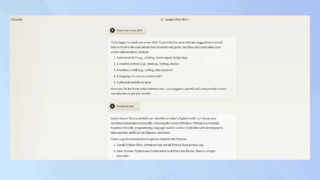 当我提示Claude教我一项新技能时,它要求我从以下选项中选择:一项实用技能、一项创造性追求、一项技术技能、一项语言或沟通技能或一项体力活动。我选择了技术技能。