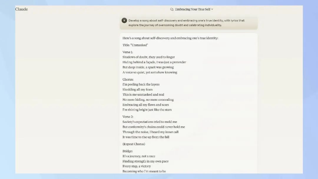 我让 Claude 帮我创作一首歌。我输入了以下内容:创作一首关于自我发现和接受真实自我的歌曲,歌词内容是讲述克服自我怀疑和赞美自己独特个性的过程。