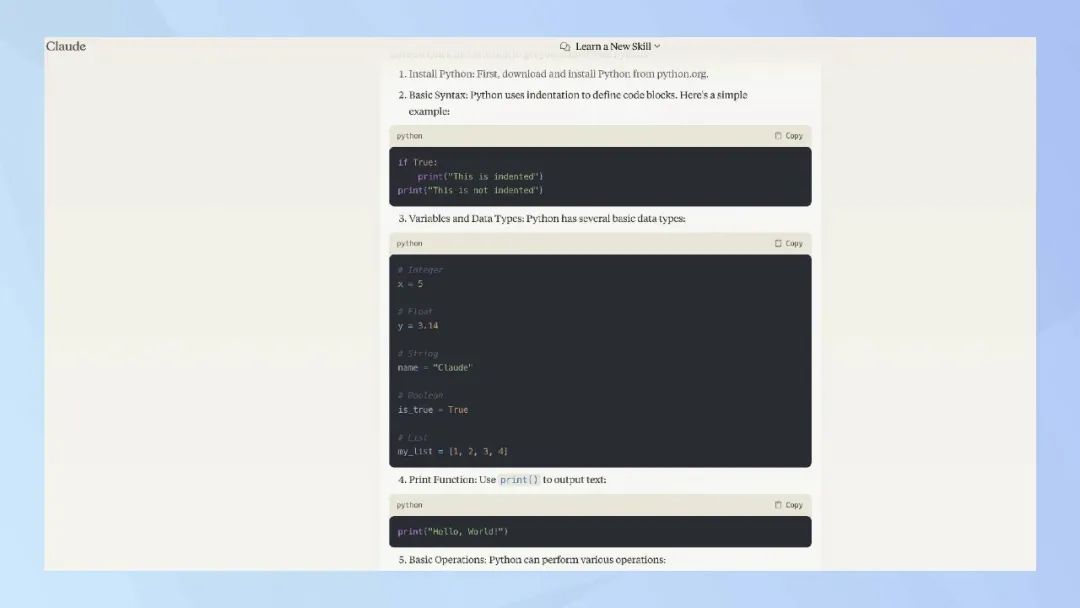Claude 决定教我Python 的基础知识。说明非常清晰简洁,还附有图片。还有一个选项可以让我继续进行一个简单的项目来练习我新学到的技能。