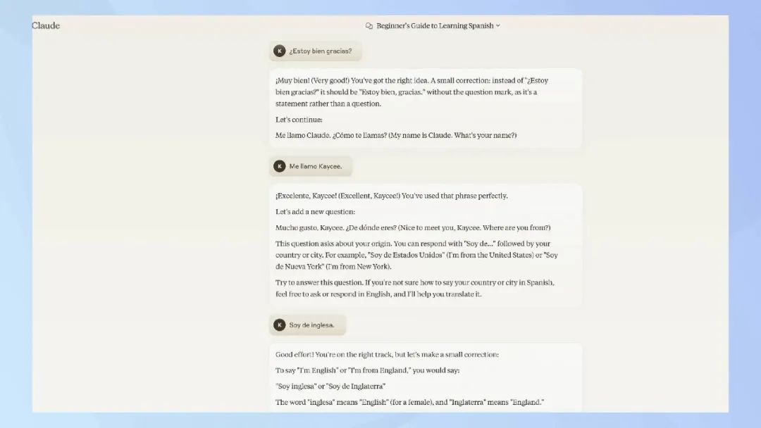 从实用的角度来看,Claude 是一位出色的老师。它用西班牙语与我交谈,当我说对时会肯定,当我说错时会明确建议纠正。
