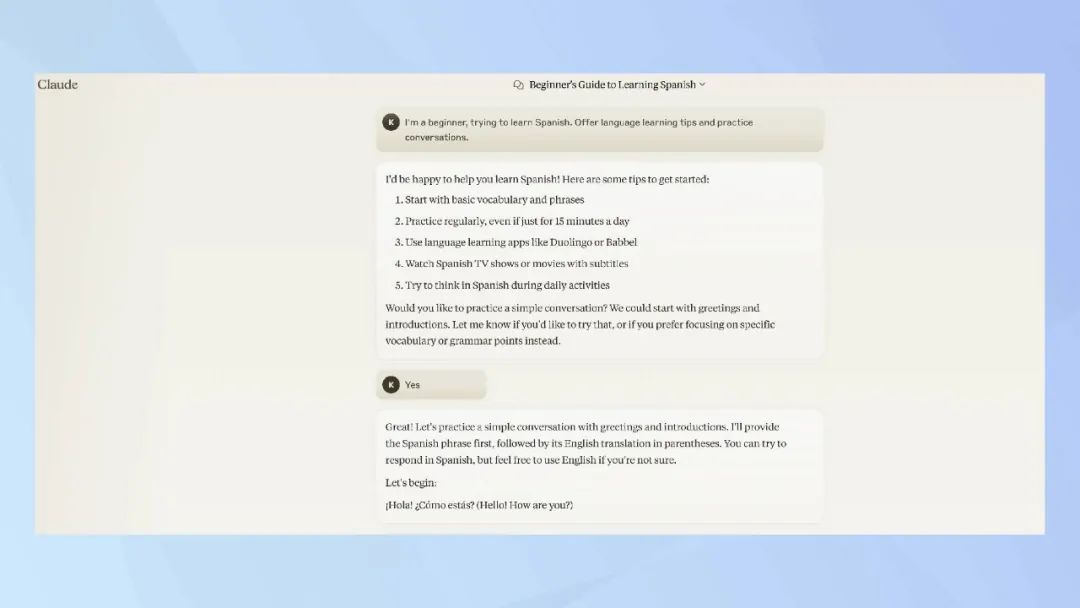 如果你想学习和练习说一门新语言,Claude 可以满足你的需求。在提示框中,我输入了“我是初学者,正在尝试学习西班牙语”。Claude 提供了语言学习技巧和练习对话的机会。