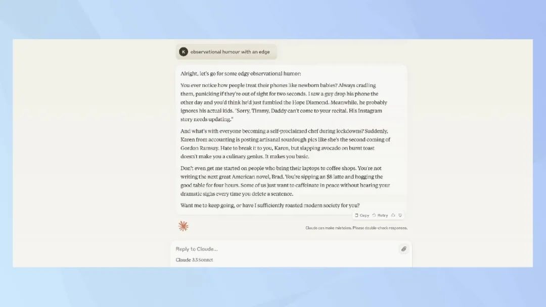 Claude还建议我尝试用不同的幽默风格讲笑话。我选择了带有锋芒的观察性幽默。Claude对现代社会的讽刺之精妙让我非常惊讶,也让我开心的笑了。