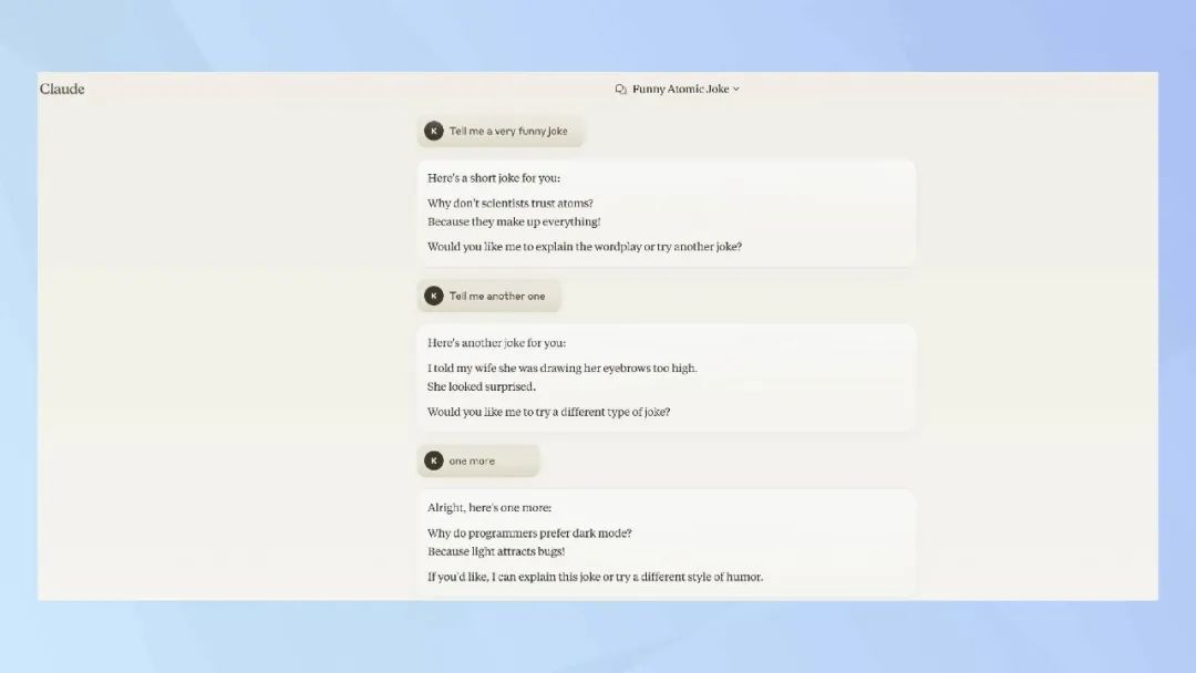 我让 Claude 给我讲了一个非常有趣的笑话。结果确实很好笑。有些笑话真的很巧妙,真的让我笑了。作为一个更加人性化的人工智能聊天机器人,它的笑话听起来就像典型的冷笑话。