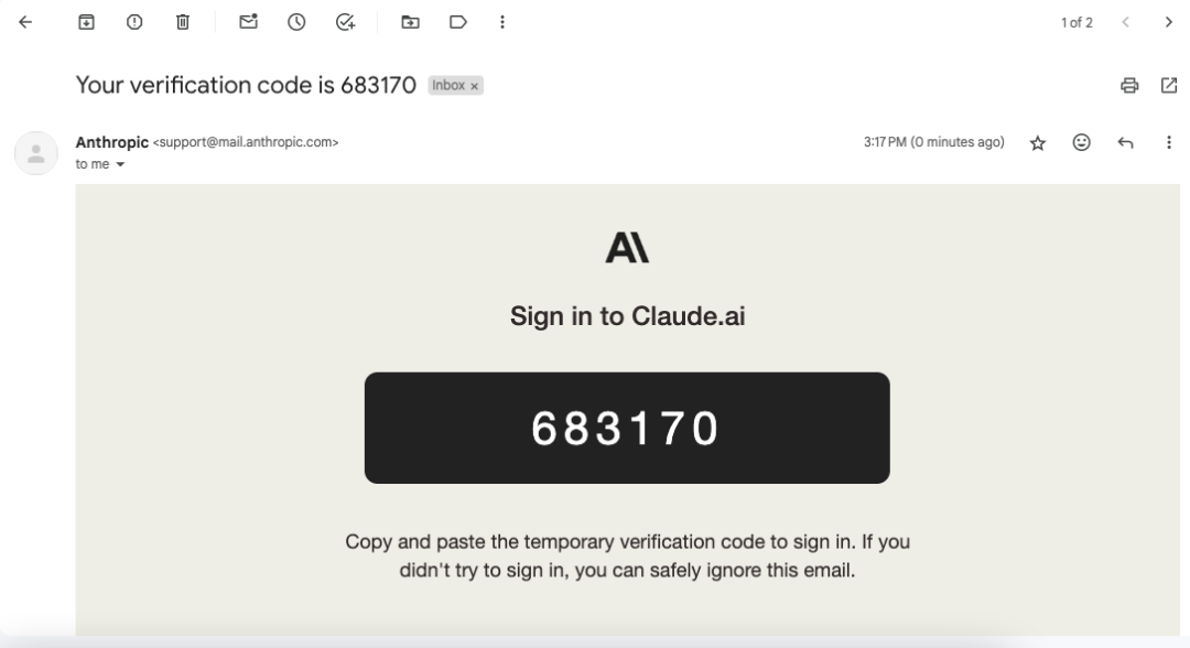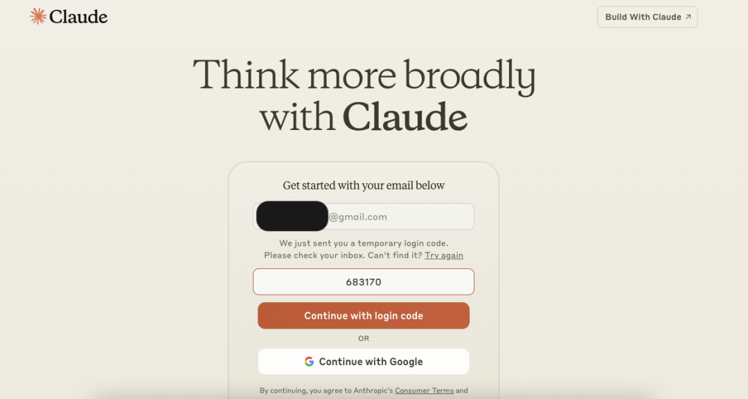 第二步:Claude 官方会给你的邮箱发一个验证码,把它复制到下面的方框中。然后,点击“Continue with login code”。
