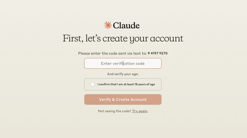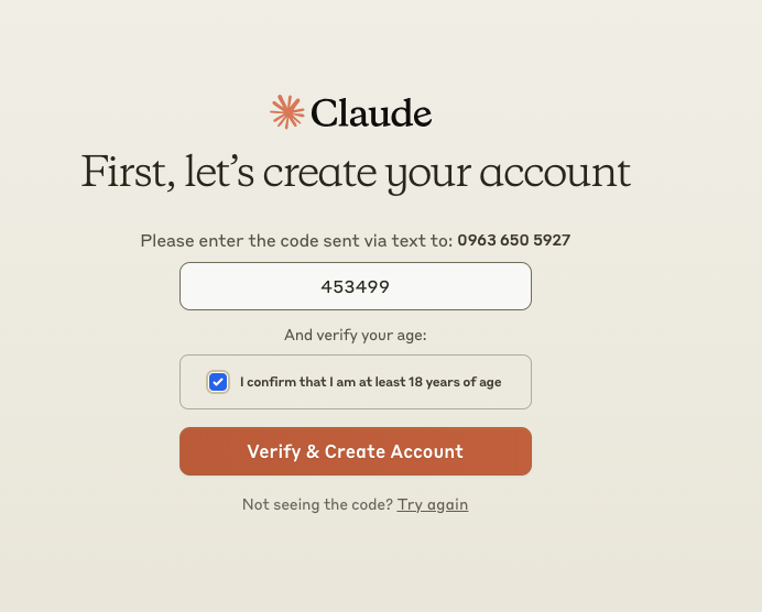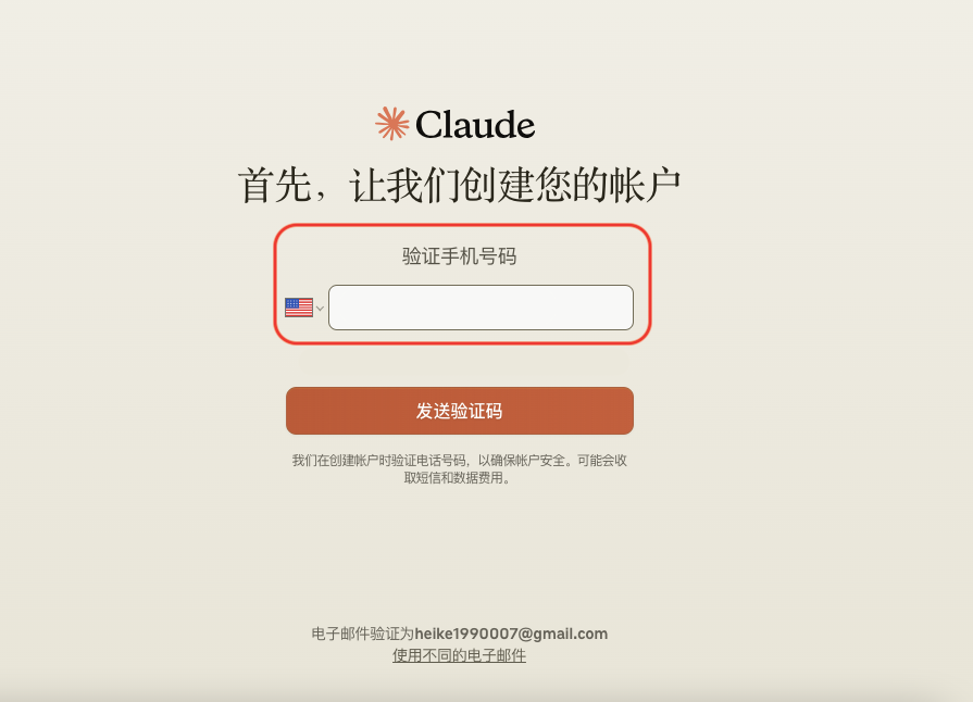 第五步:把上面的验证码复制到 Claude 界面,并勾选下面的选项,最后点击“Verify & Create Account”。