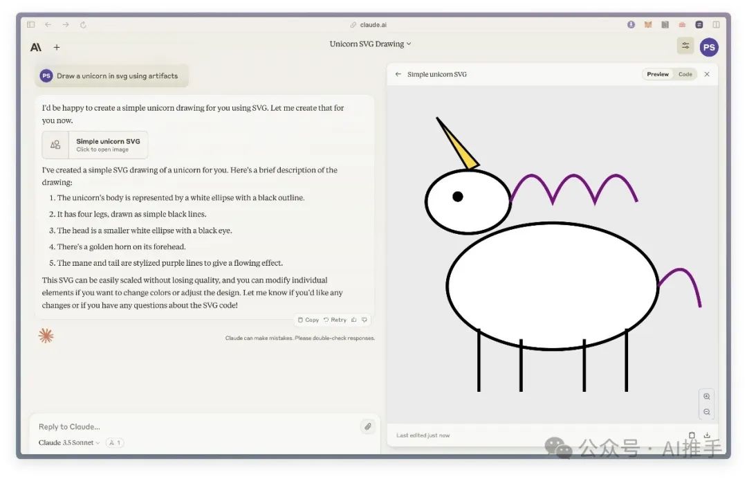 Claude 3.5 Sonnet 还可以在 Artifacts 部分生成有趣的图表和图形,而且还能以 SVG 格式生成。