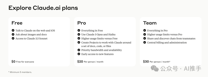 每月支付 20 美元的专业版账户可以获得免费版的所有功能,以及更高的使用限制、对 Claude 3 Opus 和 Haiku 的访问权限、优先带宽和可用性,以及使用 AI 创建以一组文档或文件为中心的项目。
