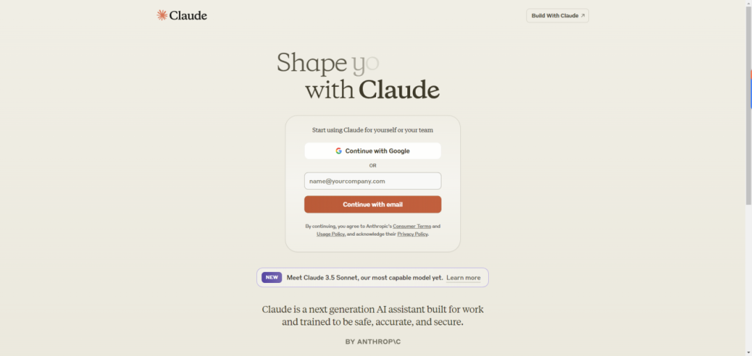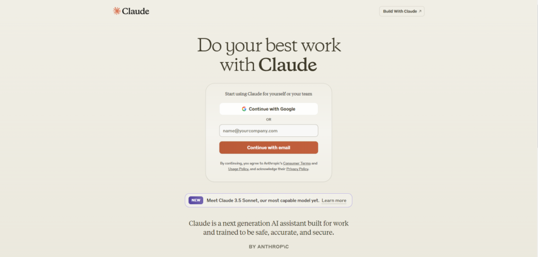注册完邮箱之后,我们回到claude的登录界面。在下方填入注册好的微软邮箱地址,点击【Continue with email】。