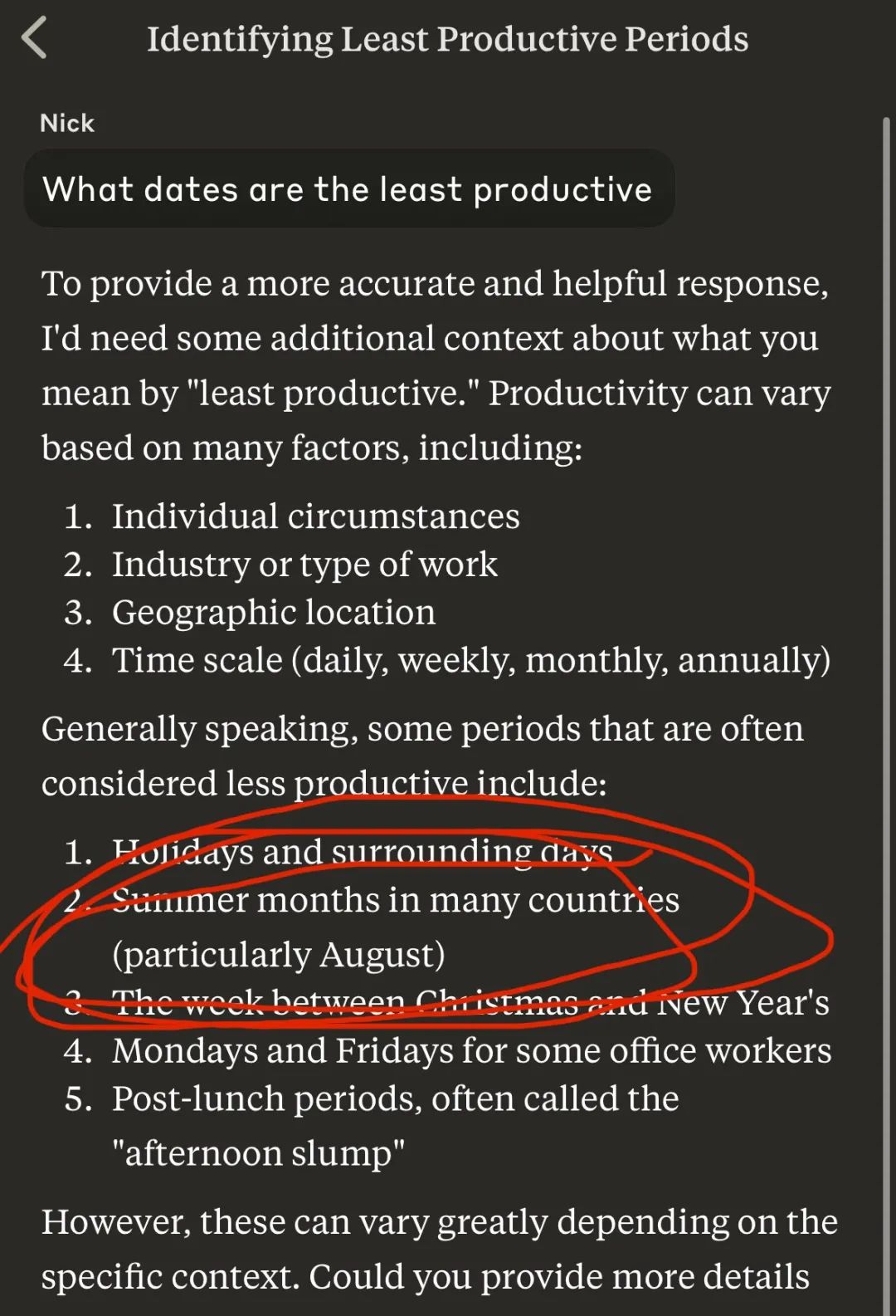 不信?有用户特意测试过,当问Claude“哪些日子生产力最低”时,它给出的答案竟然是“八月”。