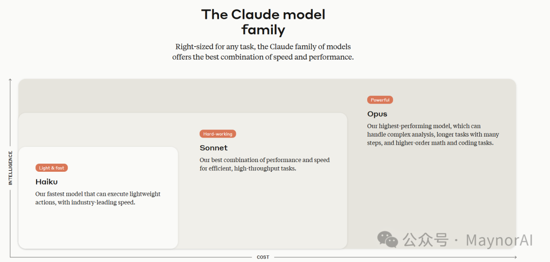 Claude 3 Opus: 最适合需要深度理解、复杂推理和高质量内容生成的场景。对于学术研究、高级分析报告和复杂问题解决特别有用。